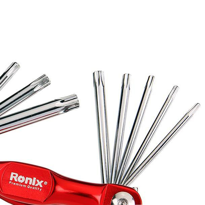 آچار آلن ستارهای چاقویی «رونیکس» (Ronix) مدل RH-2041 مجموعهای 8 عددی، دارای آچارهایی در سایزهای T-20، T-15، T-10، T-9، T-40، T-30، T-27، T-25 است. این آچار برای باز کردن و بستن پیچ و مهرههای ستارهای استفاده میشود. در صورتی برای باز کردن و بستن پیچ و مهرههای ستارهای به دنبال ابزاری مناسبی هستید و مایلید بهجای تهیهی تعدادی آچار ستارهای از یک مجموعهی آچار استفاده کنید، تهیهی این محصول را به شما پیشنهاد میکنیم. در ساخت این مجموعه آچار مشتی، از آلیاژ استیل، کروم و وانادیوم به کار گرفتهشده است تا مقاومت مجموعه را در برابر فشار، ضربه و حرکات پیچشی افزایش دهد. به دلیل فرایند سختکاری که در ساخت این محصول بهکاررفته، سری این آچارها کمتر دچار خوردگی میشوند. از سویی دیگر استفاده از روکش کروم ساتن و بدنهی ضدزنگ، استحکام و طول عمر بالاتری را برای این آچار موجب میشود. بدنهی آچار مدل RH-2041 از آلومینیوم ساخته میشود. از دیگر نقاط قوت این آچار میتوان به نحوهی قرارگیری آنها بهصورت فشرده در کنار هم اشاره کرد. گیرهای که بر روی این آچار قرارگرفته، حمل و اتصال آن را به کمر در زمان کار آُسانتر میکند. دستهی کوتاه این آچار باعث شده است تا در فضاهایی کم، عملکردی مناسب داشته باشد. شرکت رونیکس توانسته است پیوندی عمیق بین علم و بازار برقرار کرده و با عرضهی محصولات با کیفیت، بازار خوبی را برای محصولات خود فراهم کند.