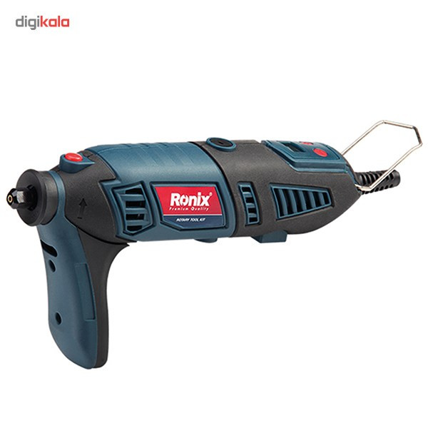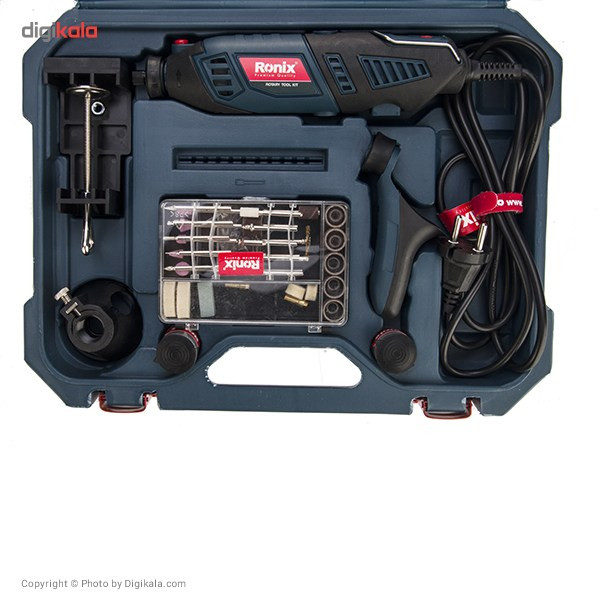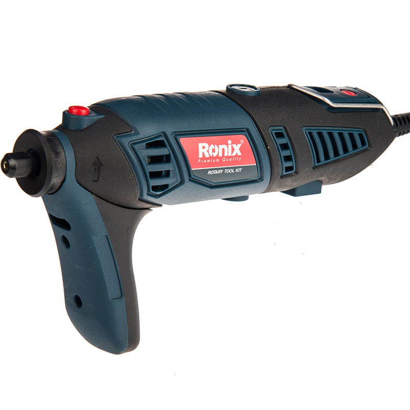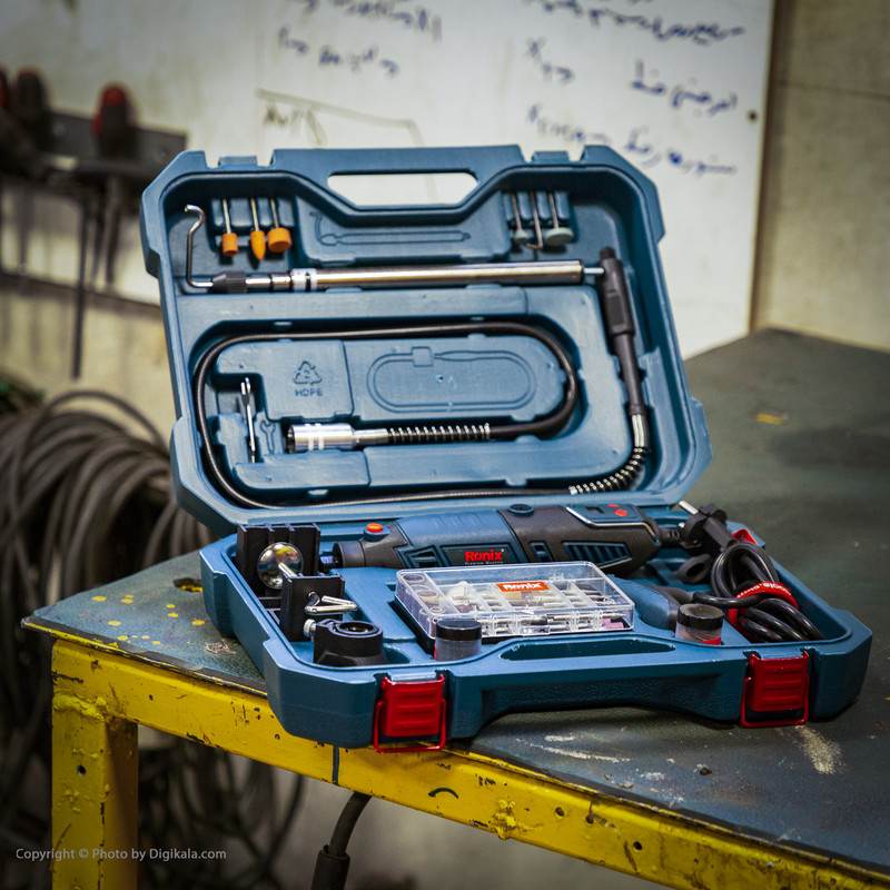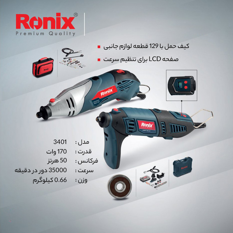 این محصول، یک فرز مینیاتوری به همراه مجموعهی کاملی از ابزار و وسایلی است که برای انجام کارهای مختلف، مورداستفاده قرار میگیرد. این دستگاه که با عنوان 3401 معرفیشده، توسط شرکت «رونیکس» (Ronix) تولید میشود. این دستگاه به یک موتور، با قدرت مناسب مجهز است که میتوان سرعت گردش آن را بهصورت دیجیتالی تنظیم کنید. 3 کولت برای کار در شرایط مختلف برای این محصول در نظر گرفتهشده است. علاوه بر این تعداد زیادی از انواع لوازم جانبی به همراه این ابزار عرضه میشود. فرز مینیاتوری مدل 3401 یک دستگاه چندکاره بهحساب میآید. از این دستگاه غالبا برای انجام کارهایی با دقت و ظرافت بالا استفاده میشود. ازجمله این موارد میتوان به برشهای دقیق فلزات و چوب، دادن طرحهای مختلف در چوب، انواع سوهانکاری و بسیاری موارد دیگر اشاره کرد. این محصول موتوری با قدرت 170 وات دارد. حداکثر سرعت گردش موتور به 35000 دوربردقیقه میرسد. سرعت گردش موتور دستگاه را میتوان به کمک بخش دیجیتالی انتهای دسته بین 8000 تا 35000 دوربردقیقه تنظیم کرد. با توجه به اینکه کاربرد این دستگاه در انجام کارهایی با ظرافت بالا است، میتوان با اتصال یکی از 3 گونهی کولت (سری دستگاه) به محصول، نیاز به در دست گرفتن دستگاه را برطرف کرد. در کنار این محصول 122 عدد لوازم جانبی هم وجود دارد. گونههای مختلف سنگ سنباده و برش، متههایی با قطر بسیار کم، صفحههای سنباده، دو نوع فرچه و انواع پایههای مخصوص دستگاه در بیت این 122 عدد لوازم جانبی دیده میشود. با استفاده از پایههای قرارگرفته در این مجموعه، میتوانید دستگاه را به چند حالت معلق، روی میز و عمودی استفاده کرد. در شغلهای مختلفی از فرزهای مینیاتوری استفاده میکنند. ازجملهی این مشاغل که در آن از این نوع فرز استفادهی بسیار زیادی میکنند، تولیدکنندگان دکورهای چوبی و فلزی هستند. شرکت رونیکس هم نمونههایی از این دستگاه را تولید کرده است. شاید کیفیت ساخت محصولات رونیکس، در حد برندهای خارجی نظیر بوش نباشد، اما با در نظر گرفتن قیمت و سطح کیفی مدل 3401، تهیهی این محصول مقرونبهصرفه به نظر میرسد. 3401 یکی از فرزهای مینیاتوری ساخت شرکت رونیکس است که با یک موتور 170 واتی کار میکند. 129 عدد انواع کولت، پایه و لوازم جانبی دیگر در کیف پلاستیکیای محصول قرارگرفته است.